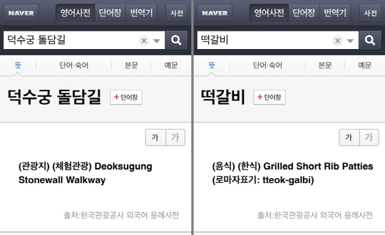 구글 번역기는 떡갈비를 'Tteokgalbi', 덕수궁 돌담길은 'Deoksugung doldamgil'와 같은 형식의 로마자 표기만 제공하고 있어, 단어에 대한 정확한 번역 정보를 확인하기 어려웠다. 반면, 네이버 사전에서는 'Grilled Short Rib Patties(떡갈비)','Deoksugung Stonewall Walkway(덕수궁 돌담길)', 'Pork and Rice Soup(돼지국밥)' 로 안내하고 있어, 외국어 사용자들이 용어에 대해 보다 자세하고, 쉬운 설명을 확인할 수 있다.