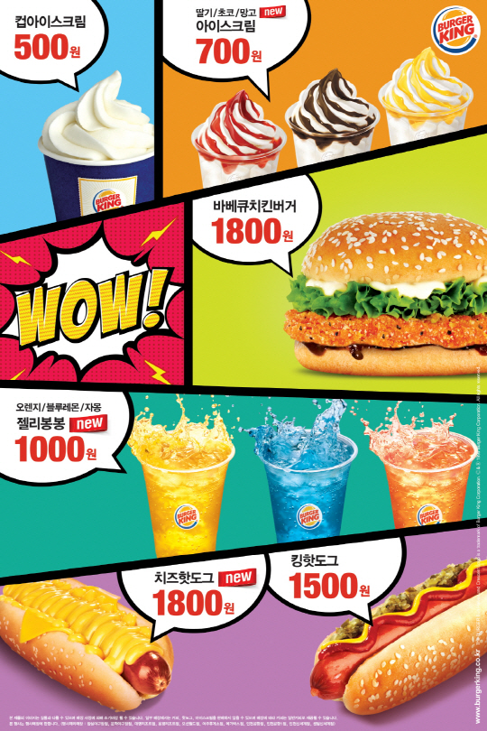 'WOW 시리즈'는 하루종일 합리적인 가격으로 간편하게 즐길 수 있도록 구성된 버거킹의 대표 디저트/스낵 메뉴군으로, 기존 인기 스낵 메뉴인 킹핫도그(단품 1,500원/콤보 2,500원)와 치즈핫도그(단품 1,800원/콤보 2,800원), 바베큐치킨버거(단품 1,800원/콤보 2,800원), 딸기/초코와 함께 망고 맛이 추가된 아이스크림 메뉴(정가 700원) 등으로 이루어져 있다.