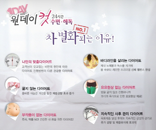 특히 원데이컷은 '뱃살 빼는 최고의 방법'이라는 키워드와 '다이어트 식품'키워드로 SNS와 주부들과 직장인들 사이에서 효과만점 이라는 평을 받고 있으며 기존 다이어트에 성공한 이들이 겪는 요요 현상에도 아름다운 몸매를 유지할 수 있게 도와줘 누구나 이용하면 효과적이다.