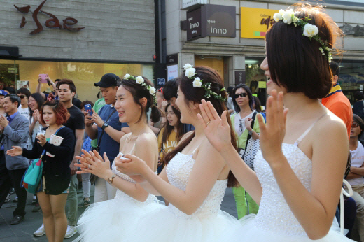 웨딩드레스와 턱시도 입은 커플들이 도심 한복판에서 춤을 춘다.ㅡ커플포털사이트 야놀자에서 준비한 '사랑한다면 야놀자'이벤트로 사람들의 관심을 끌고 있다.