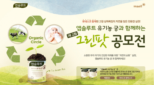 매일유업 관계자는 "'앱솔루트 유기농 궁'은 유네스코 생물권 보전지역으로 등재된 전북 고창 상하목장의 유기농 초지에서 자란 유기농 젖소의 원유로 만든 자연의 오랜 기다림과 정성의 결과물"이라며, "'유기농 궁' 제품에 담긴 철학을 토대로 아기와 자연의 건강한 미래를 위해 분유 캔 재활용을 통한 '자연의 순환' 실천에 동참하고 원료부터 제대로 된 유기농 먹거리를 만드는 친환경을 함께 만들어 나가자는 차원에서 지난해에 이어 올해도 소비자 대상 그린팟 공모전을 개최하게 됐다"고 말했다.