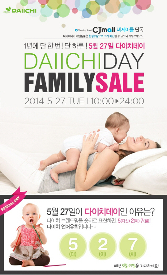 패밀리세일은 5월 27일 단 하루로 CJ쇼핑몰 사이트(www.cjmall.com)의 다이치 특별기획전으로 진행된다. 다이치 카시트와 함께 쿨시트, 아기띠, 기저귀가방 등 최고 57%까지 할인된 가격에 판매된다.(일부 품목 제외)
