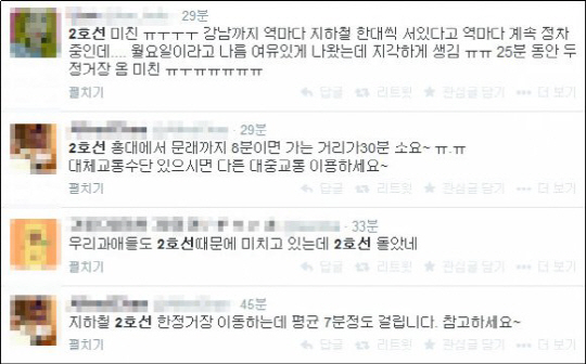 또 다른 시민은 "2호선 홍대에서 문래까지 8분이면 가는 거리가 30분 소요"라거나, "지하철 2호선 한 정거장 이동하는데 평균 7분 정도 걸립니다. 참고하세요"라며 실시간으로 당시 상황을 전하기도 했다.