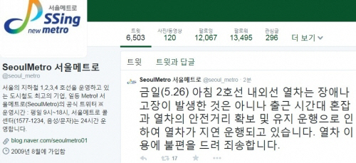 이에 이날 오전 각종 SNS에는 "2호선 지연 운행, 이게 뭐냐?", "2호선 지연 운행, 월요일 아침부터 왜 이러지?", "2호선 지연 운행, 대규모 지각 사태", "2호선 지연 운행, 월요일이라고 빨리 출근길에 나섰는데 어이없다", "2호선 지연 운행, 출근길에 왜 이러지?"등의 불만의 글이 폭주했다. <스포츠조선닷컴>