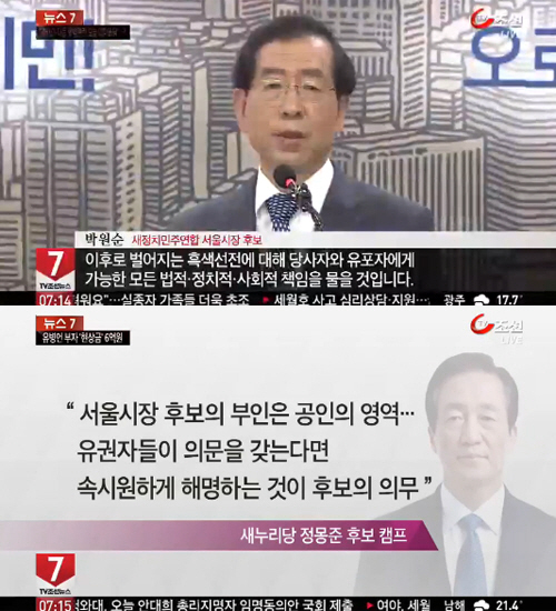 박원순 후보는 "선거는 경쟁이다. 치열하게 싸우고 내가 상대후보보다 더 낫다고 유권자에게 한 표를 호소하는 건 너무도 당연하다. 그러나 그 속에서도 우리 모두는 더 나은 내일을 만들겠다는 서로의 진정성을 의심하지 말아야 한다"며 "사실에 근거한 정책에 대한 비판과 공격이라면 얼마든지 좋다. 그렇지만 아무리 험악한 정치판이라고 하더라도 넘지 말아야 할 금도가 있다고 저는 믿는다"고 밝혔다.