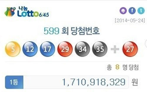 599회 당첨번호 6개를 모두 맞힌 1등 당첨자는 총 8명으로 각각 17억 1,091만 8,329원의 당첨금을 지급받는다.
