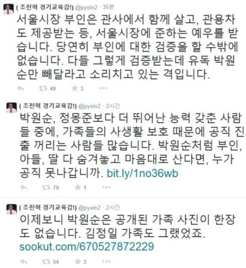 이어 "박원순, 정몽준보다 더 뛰어난 능력을 갖춘 사람들 중에 가족들의 사생활 보호 때문에 공직 진출 꺼리는 사람들이 많다"며 "박원순처럼 부인, 아들, 딸 숨겨놓고 마음대로 산다면 누가 공직 못 나가나"라고 주장했다.