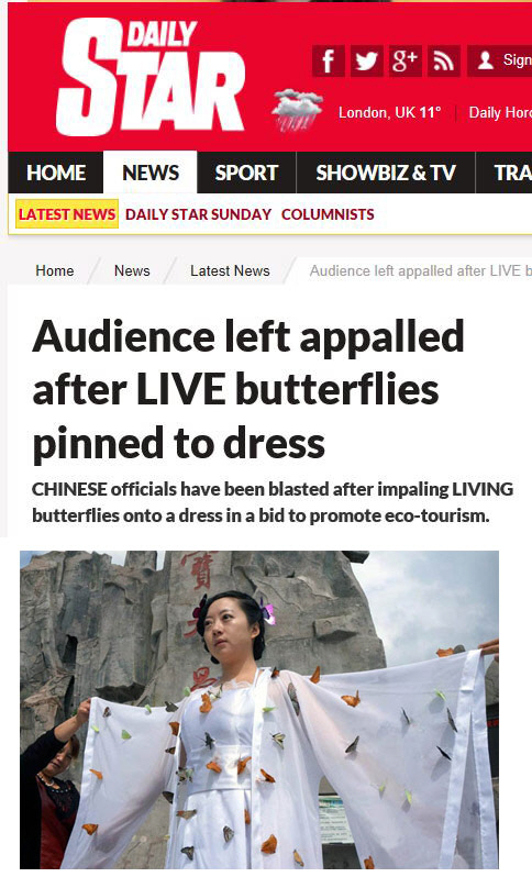 중국의 한 도시가 관광홍보의 일환으로 연 패션쇼에서 살아있는 나비를 의상으로 사용했다가 빈축을 사고 있다.