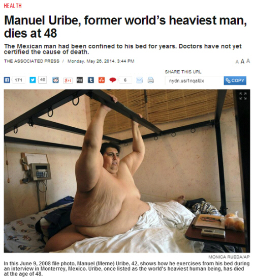 AP 등 외신에 따르면 보건당국 관계자는 지난 26일 2006년 몸무게 560㎏을 기록하며 세계에서 가장 무거운 사람으로 기네스북에 올랐던 멕시코인 마누엘 우리베(48)가 누에보레온주(州) 몬테레이의 자택에서 숨졌다고 밝혔다.