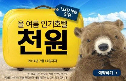 익스피디아가 진행하는 천원 호텔 프로모션은 세계 8개 도시에 위치한 호텔의 1000개 객실을 무려 천원에 예약할 수 있다.