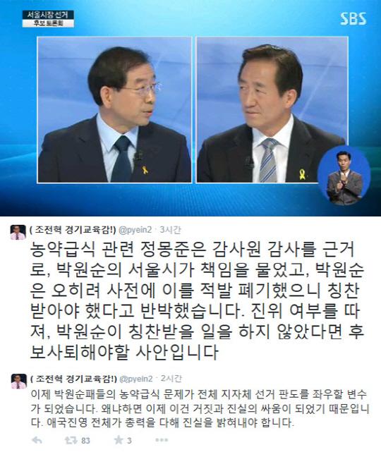 서울시장 후보 토론회 '농약급식' 논란, 진실이 궁금해"등의 다양한 반응을 보이고 있다. <스포츠조선닷컴>