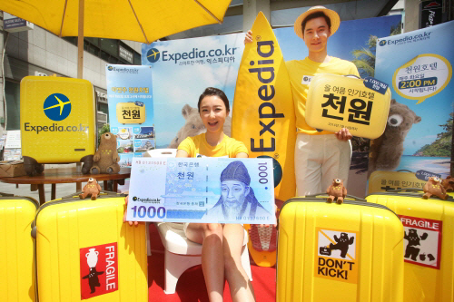 익스피디아는 27일 오전 서울 종각 젊음의 거리에서 세계 8개 도시의 호텔을 1000원에 제공하는 프로모션을 진행하고 있다.