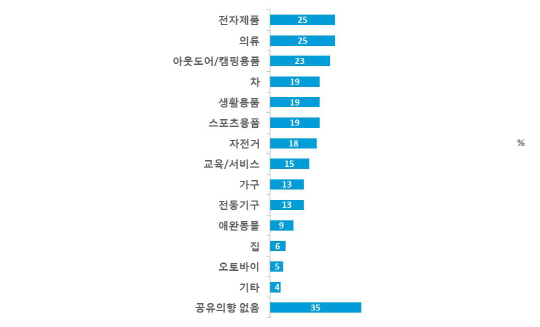 한국 응답자들의 경우 '의류(25%)'와 함께 '전자제품(25%)'을 공유 또는 대여할 의향이 가장 높은 아이템으로 꼽았으며, 이어서 '아웃도어/캠핑 용품(23%)', '자동차(19%)', '생활용품(19%)', '스포츠 용품 (19%)', '자전거(18%)' 등이 선정됐다. 주로 스포츠·레저 관련 분야의 아이템에 대한 공유 또는 대여 의향이 높은 것이다.