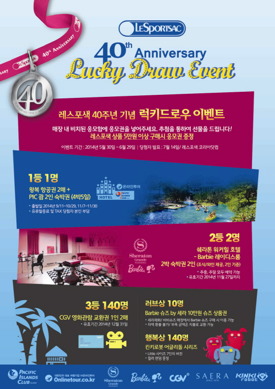 레스포색은 30일부터 6월 29일까지 '40th Lucky Draw Event'를 진행한다. 이번 프로모션은 40주년이라는 오랜 기간 동안 레스포색을 사랑해준 고객들을 위해 마련된 감사 이벤트다. 추첨을 통해 1등 1명에게는 320만원 상당의 PIC 괌 2인 호텔 4박 5일 숙박권과 온라인투어 협찬 괌 왕복 항공권 2매가 주어진다. 2등 2명에게 쉐라톤 워커힐 Barbie 레이디스룸 2인 2박3일 숙박권을 증정하며 3등 140명에게는 CGV 영화 상품권이 1인 2매씩 증정된다. 이 외에 10만원 상당의 세라제화 Barbie 슈즈 상품권이 10명, 그리고 킨키로봇의 어글리돌이 140명에게 특별상으로 증정될 예정이다.