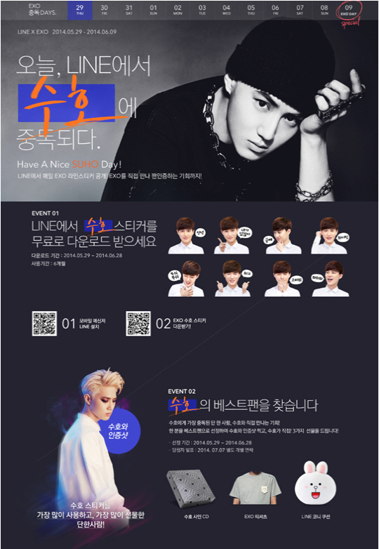 이용자들은 이벤트 페이지(http://campaign.naver.com/line_exo/suho.nhn)를 방문하면 EXO 멤버들이 직접 전하는 스페셜 스티커 소개 영상도 확인할 수 있더.