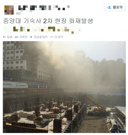중앙대 기숙사 화재 , 공사장 인부들 피해 없길", "중앙대 기숙사 화재, 기계 과열로 불이 난건가?", "
