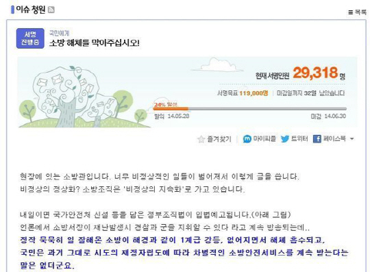 소방방재청 해체 반대 서명, 인력난에 장비 부족도 모자라 해체까지 진행되다니", "