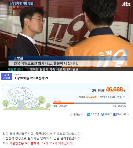글쓴이는 "소방 조직은 '비정상의 지속화'로 가고 있다. 정작 묵묵히 일 잘해 온 소방이 해경과 같이 1계급 강등되고 없어진다"며 "지금이라도 국가안전처장이나 차장에 현장경험이 풍부하고 카리스마 있는 소방관이 임명돼 지휘할 수 있게 해주시고 더 이상 부족한 인력, 장비라는 말이 나오지 않도록 소방공무원의 국가직화로 고르게 안전예산이 집행될 수 있도록 해달라"고 주장했다.