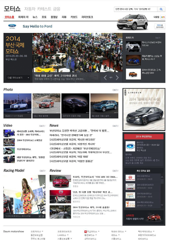 이번에 '다음 자동차'에 오픈한 '2014 부산국제모터쇼' 특집페이지(http://auto.daum.net/motorshow)는 모터쇼에 출품되는 차량을 다양한 부위별 포토와 함께 볼 수 있는 '화제의 차', 모터쇼 관련 뉴스를 실시간으로 제공하는 '뉴스', 모터쇼 현장 사진을 한 눈에 볼 수 있는 '포토', 모터쇼 출품 차량을 생생하게 확인할 수 있는 '동영상', 자동차 전문지들의 모터쇼 심층분석 콘텐츠를 제공하는 '리뷰' 등으로 구성된다.