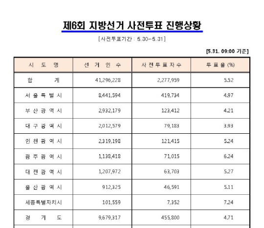 지방선거 사전투표율, 이틀째인 31일 오전 9시 현재 5.52%..지방선거 사전투표시간은?