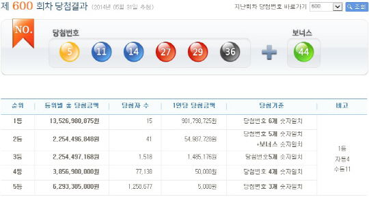 나눔로또는 로또복권을 추첨한 결과 '5, 11, 14, 27, 29, 36' 등 6개가 1등 당첨번호로 뽑혔다고 31일 밝혔다. 2등 보너스 번호는 '44'이다.