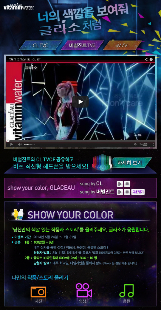 또한 글라소 비타민워터는 지원금 이외에도 매주 우수작 10명을 선정해 글라소 비타민워터 500㎖ 한 상자를 경품으로 제공한다. 버벌진트와 씨엘의 TV CF를 SNS을 통해 공유하면 추첨을 통해 매주 1명씩 비츠 바이 닥터드레 헤드폰을 제공하는 페이스북 경품 이벤트도 함께 진행한다.