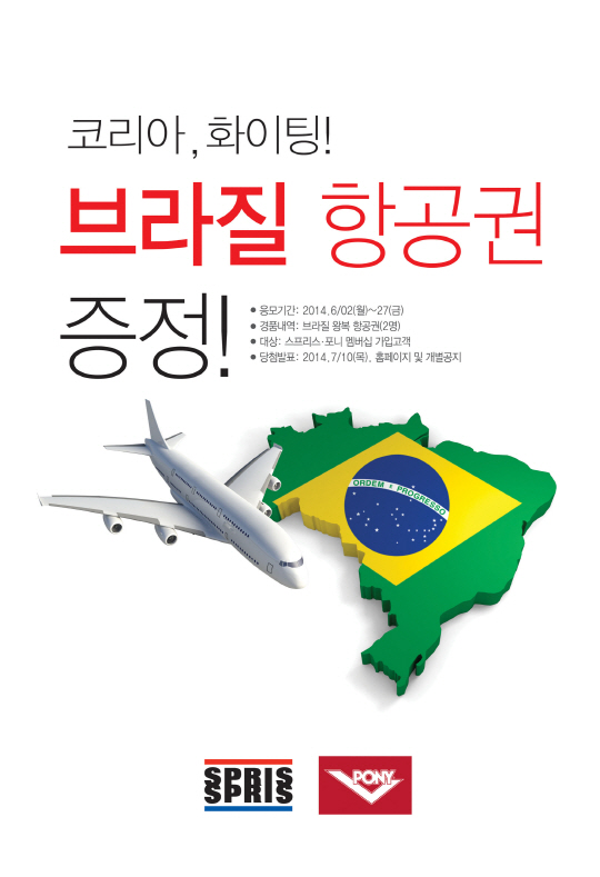 2일부터 27일까지 진행되는 이번 이벤트는 스프리스 멤버십에 가입하는 고객을 대상으로 추첨을 통해 '2014 월드컵'이 열리는 브라질 왕복 항공권(2인)을 증정하는 행사다. 참여 방법은 전국 스프리스 및 포니 매장에 방문해 구매 여부와 관계없이 멤버십에 가입하면 된다.