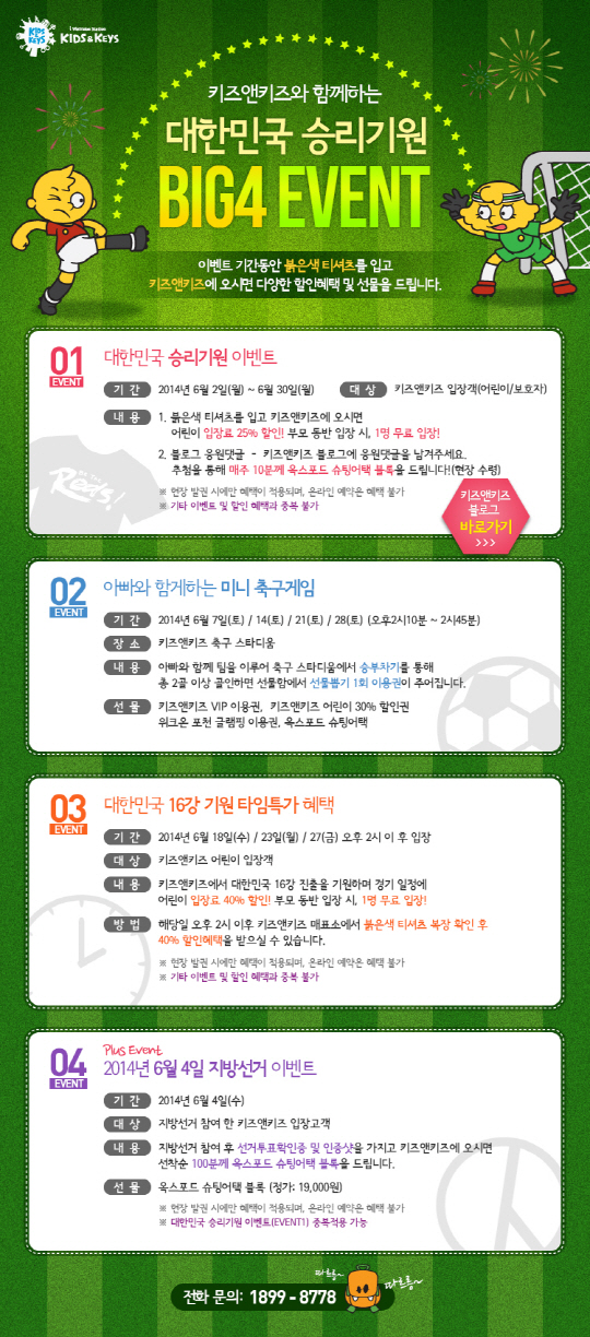 '키즈앤키즈'는 브라질 월드컵을 맞아 2일부터 6월 30일까지 한국 팀의 상징인 붉은 색의 티셔츠를 입고 방문할 경우 어린이 입장료를 25% 할인해주며 부모님 동반 시에는 부모 중 1명 무료 입장의 혜택을 제공한다. '키즈앤키즈' 블로그(blog.naver.com/enmplus)에 대한민국 승리를 기원하는 응원 덧글을 달면 매주 추첨을 통해 옥스포드 블록을 증정한다. 또 대한민국의 경기가 있는 있는 4일(수), 18일(수), 23일(월), 27일(금) 오후 2시 이후 입장의 경우 어린이 입장료의 40%를 할인하는 파격적인 행사로 대한민국의 월드컵 16강 진출을 응원한다.