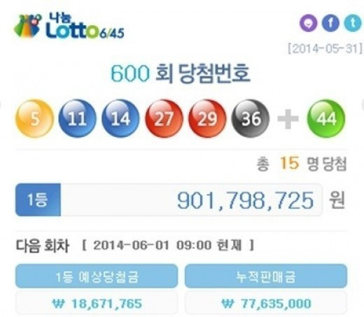 지난달 31일 나눔로또에서 발표한 로또 600회 당첨번호는 5, 11, 14, 27, 29, 36 보너스번호는 44다.