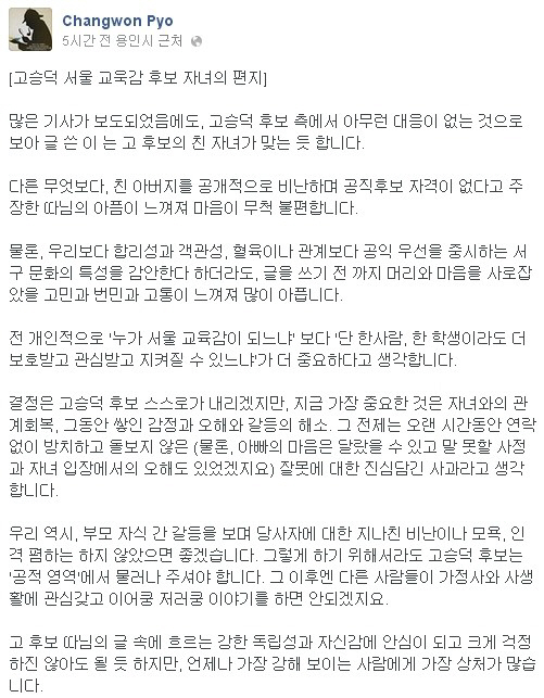 또 "개인적으로 '누가 서울 교육감이 되느냐' 보다 '단 한사람, 한 학생이라도 더 보호받고 관심받고 지켜질 수 있느냐'가 더 중요하다"며 "결정은 고승덕 후보 스스로가 내리겠지만, 지금 가장 중요한 것은 자녀와의 관계회복, 그동안 쌓인 감정과 오해와 갈등의 해소. 그 전제는 오랜 시간동안 연락없이 방치하고 돌보지 않은 잘못에 대한 진심담긴 사과라고 생각한다"라고 썼다.
