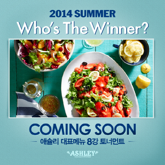 아메리칸 그릴 & 샐러드 애슐리에서 일찍이 시작된 무더운 여름을 시원하게 날려버릴 2014 SUMMER메뉴를 선보인다. 6월 3일 출시되는 SUMMER 메뉴는 "Who's the WINNER?"라는 콘셉트로 기존 시즌메뉴 출시와는 다른 특별한 방식으로 준비되어 눈길을 끈다. "Who's the WINNER?"라는 타이틀에 걸맞게 여름 메뉴들이 애슐리의 '대표메뉴'를 차지하기 위해 서로 경쟁하는 구도로 고객들에게 긴장감과 재미를 선사할 예정이다.