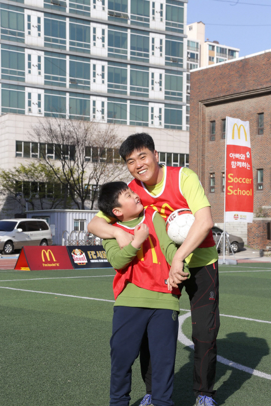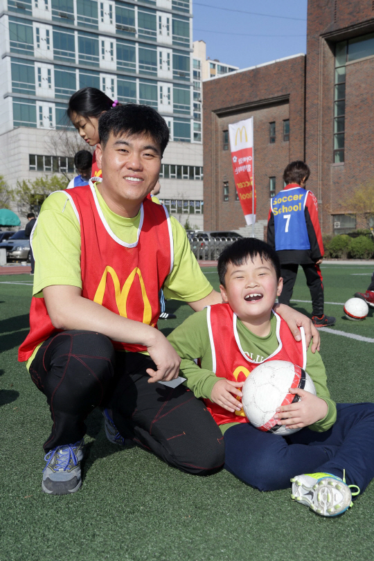 전용화씨가 아들 민수군과 함께 '로날드 맥도날드의 어린이 축구교실-아빠와 함께 하는 축구교실'에서 즐거운 시간을 보내고 있다.