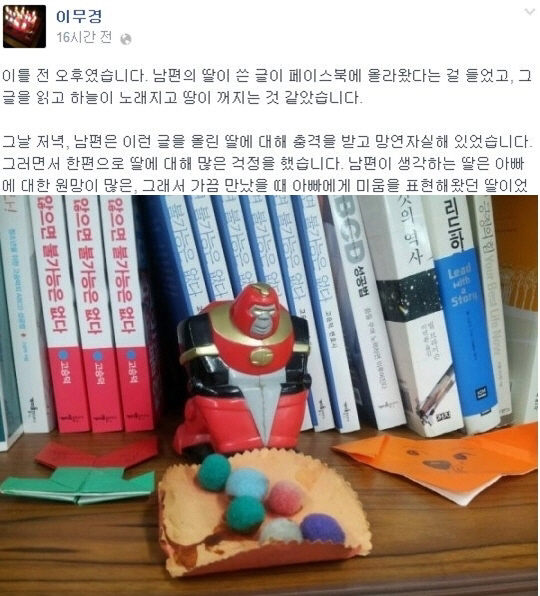 특히 이무경씨는 "따님이 이 글을 읽을 것이라고 생각하고 이 한 가지만 알아주었으면 좋겠다. 아버지는 두 아이의 어렸을 적 물건들을 옆에 두고 보면서, 잊지 않고 늘 그리워하고 있었다는 것을"이라며 "아버지 책상 위에 놓은 종이접기와 장난감을 함께 보면서 옛이야기를 할 기회가 언젠가 왔으면 좋겠습니다. 부모자식간은 하늘도 끊을 수 없는 인연이니까"라며 글을 마무리했다.