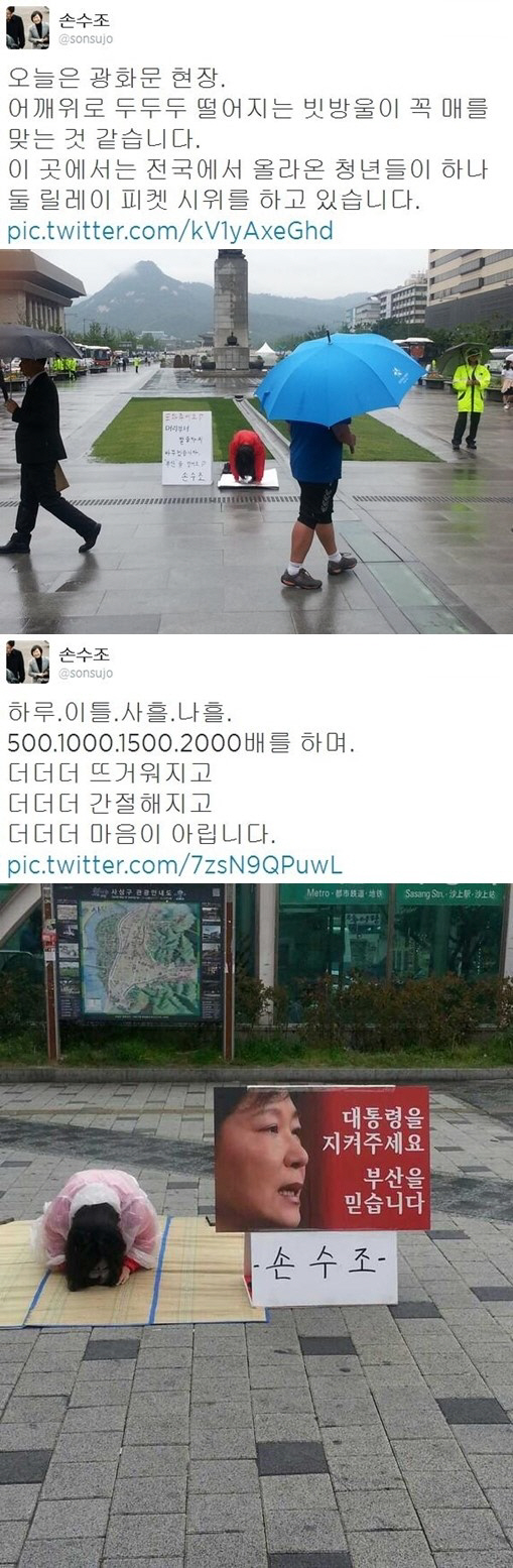 또 손수조는 "오늘은 광화문 현장. 어깨위로 두두두 떨어지는 빗방울이 꼭 매를 맞는 것 같습니다. 이곳에서는 전국에서 올라온 청년들이 하나 둘 릴레이 피켓 시위를 하고 있습니다"라는 글과 함께 서울 광화문광장에서 500배 유세를 하고 있는 사진도 공개했다.