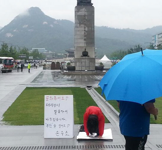 이와 함께 손 위원장 옆에는 1인 시위를 하는 시민이 '세월호 아이들이, 유가족들이 살려달라고 울부짖을 때 당신들은 도와주었나요? 도와주세요슌 표 구걸?"이란 피켓을 들고 있어 눈길을 끈다.