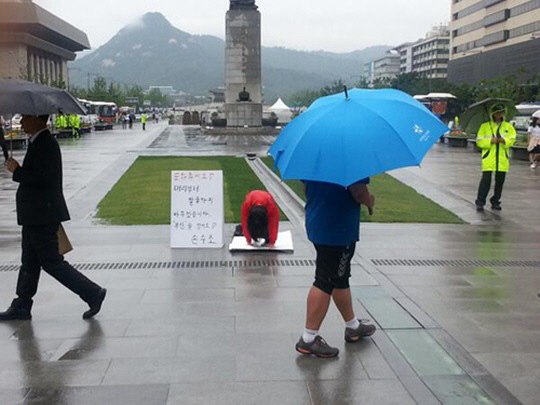 손수조는 비가 내리는 서울 광화문광장에서 돗자리 위에서 500배를 하고 있었다.