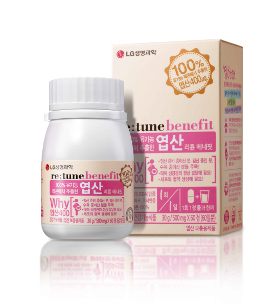 LG생명과학 프리미엄 건강기능식품 리튠이 판매하는 '리튠 베네핏 엽산'은 100% 유기농 레몬에서 추출한 엽산을 사용해 하루 1정으로 400ug를 섭취할 수 있다. 국제적 안심 마크인 유대인 코셔 인증을 획득한 원료를 사용한 것이 특징이다.