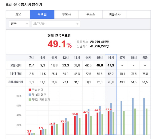 중앙선거관리위원회에 따르면 오후 4시 현재 총유권자 4129만6228명 중 2025만0118명이 투표에 참여하며 49.0%의 투표율을 기록했다.