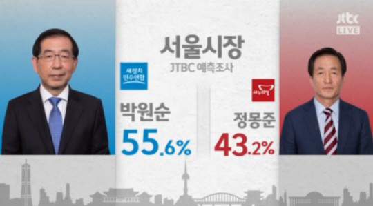 같은 시간 JTBC가 발표한 예측 조사 결과에서도 박원순 후보가 55.6%, 정몽준 후보가 43.2%의 득표율을 예측하며 박원순 후보의 당선을 유력시했다. 두 후보의 격차는 12.4% 포인트다.