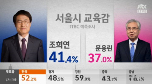 JTBC 출구조사 결과에서도 조희연 후보 41.4%, 문용린 후보 37.0%로 조희연 후보 당선이 예측됐다.