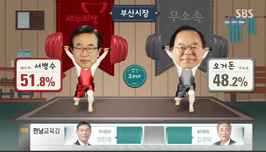 그러나 JTBC가 발표한 예측 결과에서는 오거돈 무소속 후보가 53.7%를 얻어 서병수 후보(46.3%)를 다소 앞지른 것으로 예측됐다.