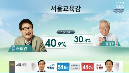 4일 오후 6시 투표 종료와 동시에 발표된 KBS·MBC·SBS 방송3사 공동출구조사 결과에 따르면 조희연 후보가 40.9%의 지지율로 현직 서울시교육감인 출신인 문용린 후보(30.8%)에 비해 10% 가량 앞선 것으로 나타났다.