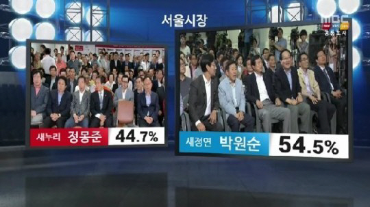 같은 시간 JTBC가 발표한 예측 조사 결과에서도 박원순 후보가 55.6%로 정몽준 후보의 43.2% 보다 12.4% 앞선 것으로 나타났다.