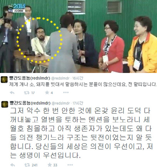 또 "그저 악수 한 번 안한 것에 온갖 윤리 도덕 다 꺼내놓고 열변을 토하는 멘션을 보노라니 세월호 침몰하고 아직 생존자가 있는데도 왜 다들 의전 챙기느라 구조는 뒷전이었는지 알 듯 하다. 당신들의 세상은 의전이 우선이고, 저는 생명이 우선이다"며 "제게 개나 소, 돼지를 빗대서 말씀하시는 분들이 많으신데요, 전 말띠다"고 덧붙였다.