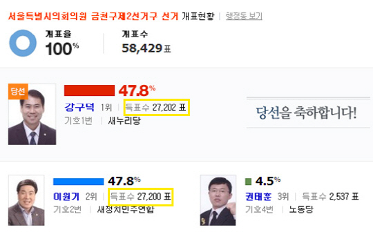 하지만 이 후보가 얻은 표는 2만7200표로 강 후보보다 단 2표가 적었다. '초박빙' 승부였다.