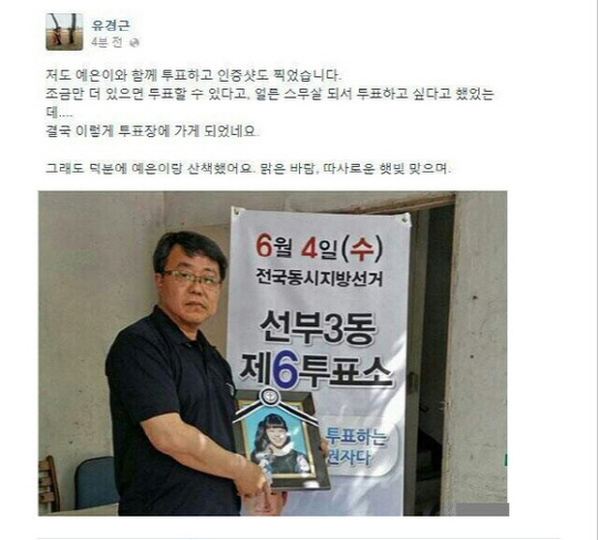 유경근씨는 "저도 예은이와 함께 투표하고 인증샷도 찍었습니다. 조금만 더 있으면 투표할 수 있다고, 얼른 스무살 되서 투표하고 싶다고 했었는데… 결국 이렇게 투표장에 가게 되었네요" 라며 안타까운 마음을 전했다.