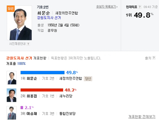 강원도지사 최문순 선거결과, 신기한 상황이네요", "