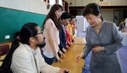 박 대통령은 투표를 마친 뒤 투표 참관인들과 악수를 나눴다. 그러나 노동당 참관인으로 참석한 김한울 노동당 종로·중구 당원협의회 사무국장은 박 대통령의 악수를 거부했다.