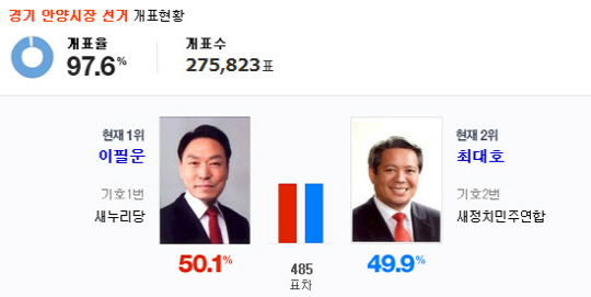 안양시만안구선거관리위원회는 회의를 열어 이의를 받아들기로 결정해 이날 오전 8시10분부터 재검표가 진행되고 있다. 현재 새누리당 이필운 후보와 새정치민주연합 최대호 후보의 표차는 485표차다.