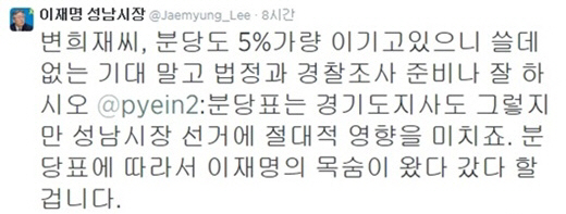 이재명 당선자는 5일 새벽 자신의 트위터 계정을 통해 "변희재씨, 분당도 5%가량 이기고 있으니 쓸데없는 기대 말고 법정과 경찰조사 준비나 잘 하시오"라는 글을 남겼다.